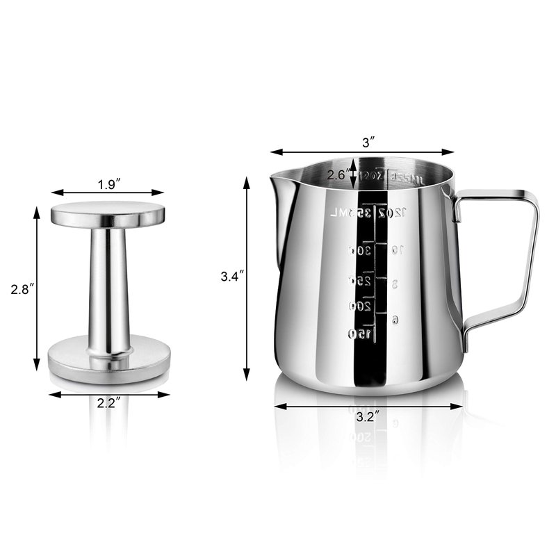 - Dishwasher-safe for the Frothing Pitcher and hand wash only for the tamper.Pitcher body size: 3.2"D x 3.4"H, tamper two flat tamping surfaces, 50mm (around 1.9") and 56mm (around 2.2”)
