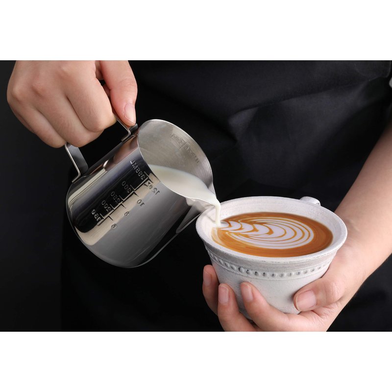 - Ideal for using with a cappuccino or espresso machine to steam and froth milk or cream. This frothing pitcher set is great for making lattes, cappuccinos, and other milk-based drinks