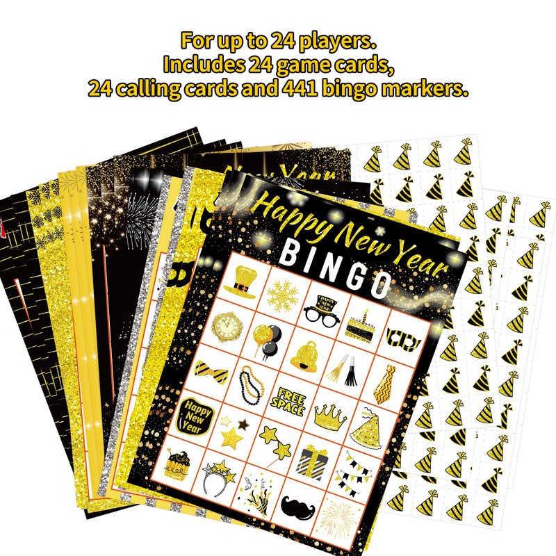 - Package Includes: 24 happy New Year Bingo Game Cards, 441 Hat Bingo Card Chips and 24 call out cards; 7 x 5 1/5 inches player cards; Easily cut along dotted lines of chips sheets and calling card sheet