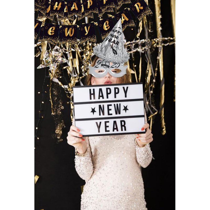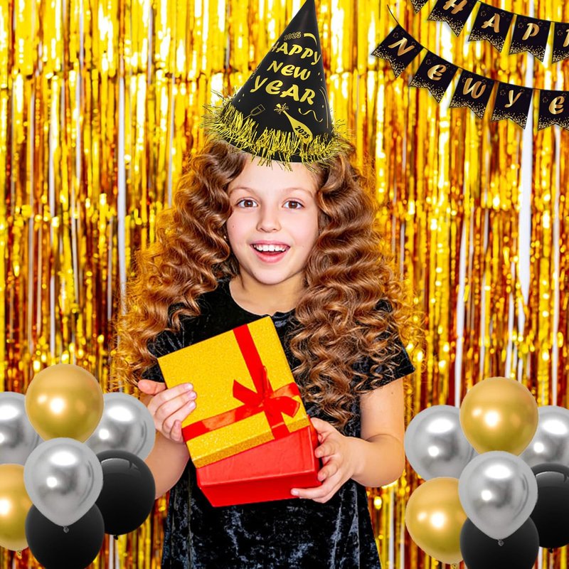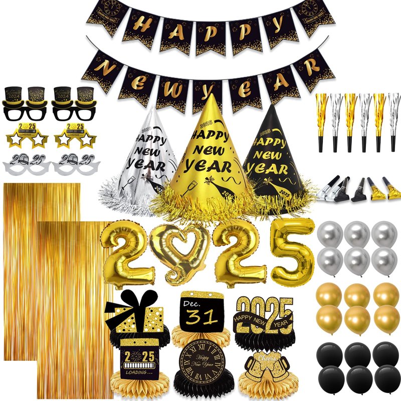- NEW YEARS EVE PARTY SUPPLIES 2025 - This new years party supplies pack includes 6 party hats, 6 party glasses, 12 blowouts, 18 balloons, 6 centerpieces for table, 2 foil Curtains, 2025 Foil Balloons and a happy new years banner