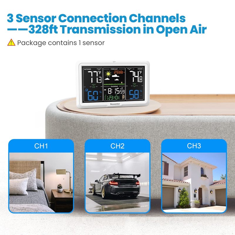 - [3 Channels to Detect Indoor Outdoor Temperature & Humidity] This weather stations supports 3 sensors to detect the temperature and humidity of multiple locations, such as bedrooms, kitchens, garages, basements, food storage rooms and outdoors ect,. Package contains 1 sensor.