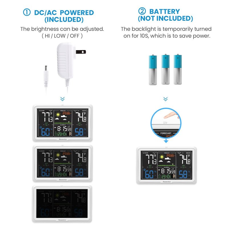 - [Atomic Weather Clock Automatic Calibration Function] After setting the time zone(PST, MST, CST, EST), this digital weather station will automatically synchronize and calibrate the atomic clock(WWVB) every morning to obtain the correct time, date and moon phase. If the signal around your house is weak, you can turn off this function and set the time manually, which will no affect any other functions.