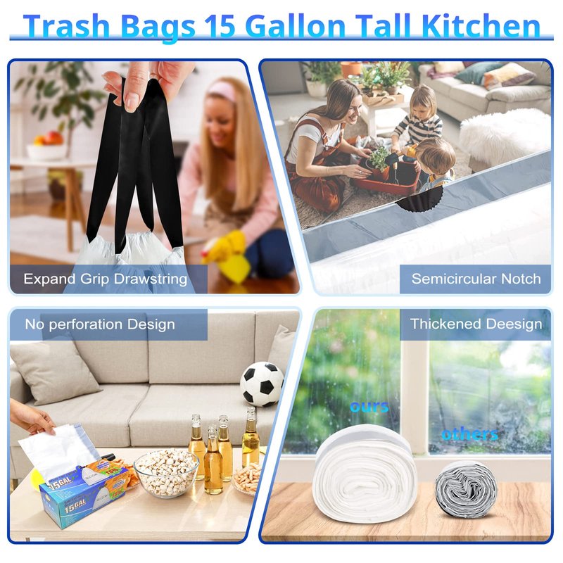 - đăStrong Drawstring&No Tearing Designă: Tall kitchen 15 gallon drawstring trash bags, white plastic trash bag with black drawstring closure for easy tying and carrying. We have thickened and widen the drawstring part, it is enough to lift the weight of a larger capacity than the garbage bag itself. The durable drawstring ensures that the bag stays in place. The bags in each roll of garbage bags are independent, so there is no need to tear them, and there will be no waste of tall trash bags.