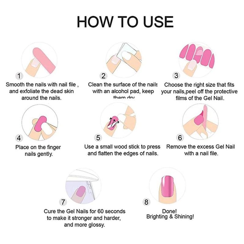 1. Gel nail strips stickers, perfect suitable for nail or nail tip, fit for most nails. 2. Spring nail gel stickers,elegant and fashionable style, easy to match any nail. 3. Gel nail wraps very easy to use, suitable for professional Salon and Home use. 4. Great nail decoration for parties. 5. Easy removing, change the pattern any time. How to Use: