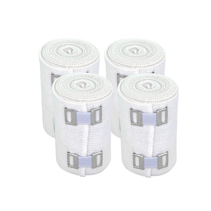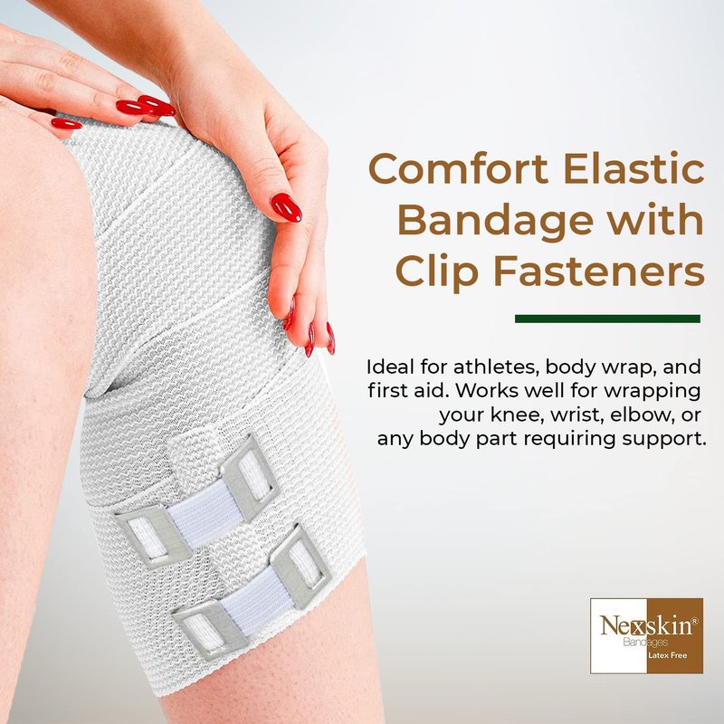 NexSkin 3 Inch Organic American Cotton elastic bandage with metal clips to provide secure closure and moderate compression. Our comfortable elastic wraps are made of latex free material to avoid any allergic reaction. The odor resistant fabric allows for extended use even during high intensity activities. The 2 metal clip fasteners keep the wrap secured in place for stability. Whether you're recovering from surgery, a sports injury, or require compression for daily wear, you can rely on NexSkin elastic bandages to support you. Add NexSkin soft woven bandages to your household first aid kit or athletic training supplies for relieving pain, joint support, or promoting healing.The custom fit compression wraps are ideal for prolonged wear and easy-to-use for wrapping an ankle, knee, thigh, foot, wrist, or other body part. Adjust the stretchy wrap to your desired tightness for providing pain relief and stability to a sprain, strain, or to promote circulation to your muscles. Our high quality NexSkin bandages are washable and can be reused for multiple wears.3 Inches Wide4 Pack13 - 15 Feet (Stretched)Latex FreeNonsterileMetal Clip FastenersBlended with Organic USA Pure Virgin Cotton Available in 2 Inch, 3 Inch, 4 Inch, and 6 Inch widths NexSkin Cotton Elastic Bandages