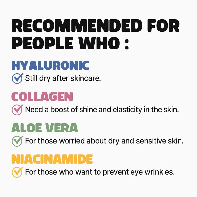 - COLLAGEN – The main component of the dermis accounts for 90% of your skin. It helps to keep your skin elastic and glowing by enhancing skin’s natural moisture barrier to make your skin moisturized.