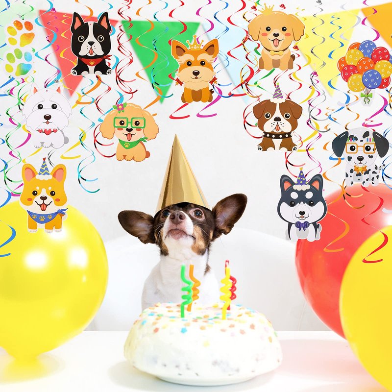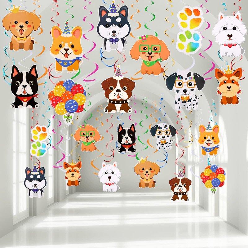 - Nice Combinations: the package includes 22 pieces dog birthday hanging swirls with double sided cards in 11 styles, 2 pieces per style, and 8 pieces double spiral ceiling hanging decorations in blue yellow, red, and purple, 30 pieces in total, a nice combination with sufficient quantity to meet your party decoration needs