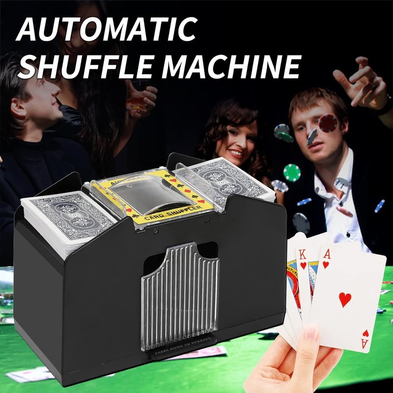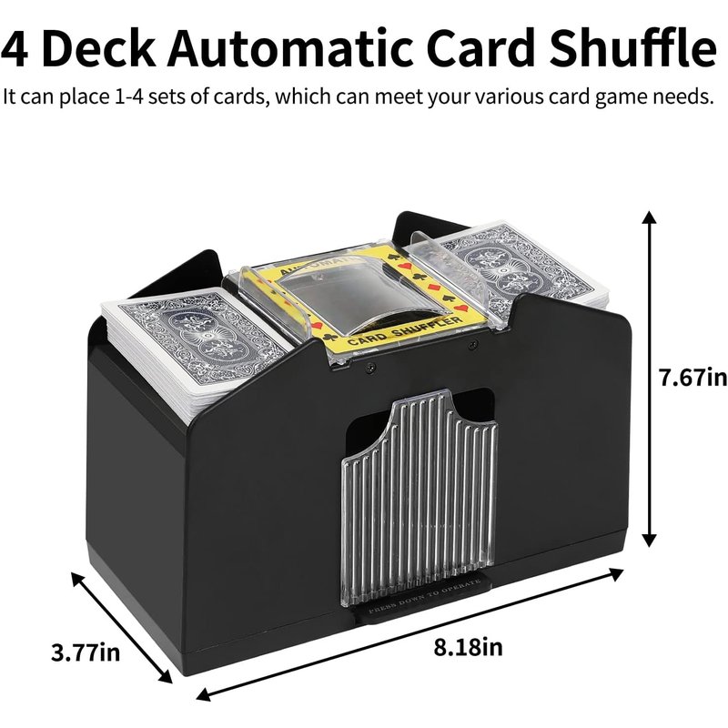 - 【High-Speed 4 Deck Card Shuffling 】With gears on each side, 4 deck card shuffler can evenly and accurately drive the playing cards into the tray in a swift and smooth motion. Insert the cards into the 2 openings and they'll return automatically shuffled at the push of a button,up to 4 decks of cards.