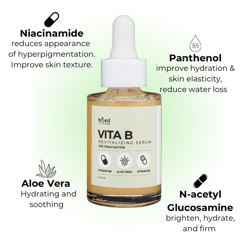 Hydrating at every step, our high-performance Vita B Revitalizing serum gives thirsty skin a mega-dose of moisture that will prevent it from feeling dry and looking dull (perfect for dry skin). Suitable for all skin types, this rebalancing serum works to reduce the over-production of sebum (perfect for oily skin), visibly refines the appearance of large pores, and improves the smoothness of uneven skin texture. Enriched with a skin-strengthening blend of 10% Niacinamide, a skincare go-to ingredient that helps to control acne and blemish-causing bacteria that can lead to clogged pores, alongside NAG (n-acetyl-glucosamine), improving the appearance of dark spots on the skin caused by sun exposure and premature aging. While, Panthenol works in harmony to replenish lost moisture and help to minimize the appearance of hyperpigmentation for a noticeably clear and plump complexion.