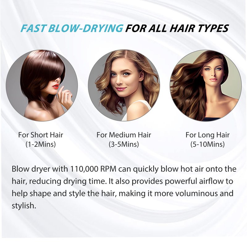 - [High-speed brushless motor] Nicebay high-speed professional hair dryer is equipped with 1600W power and 110000RPM high-speed brushless motor, which can make the wind speed up to 22m/s and dry your hair faster