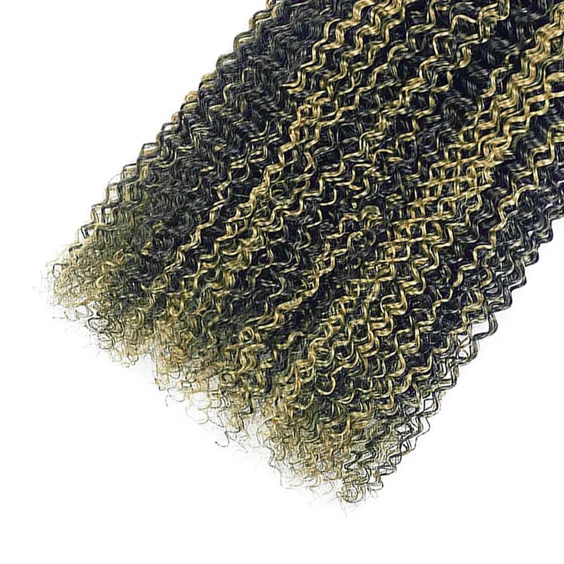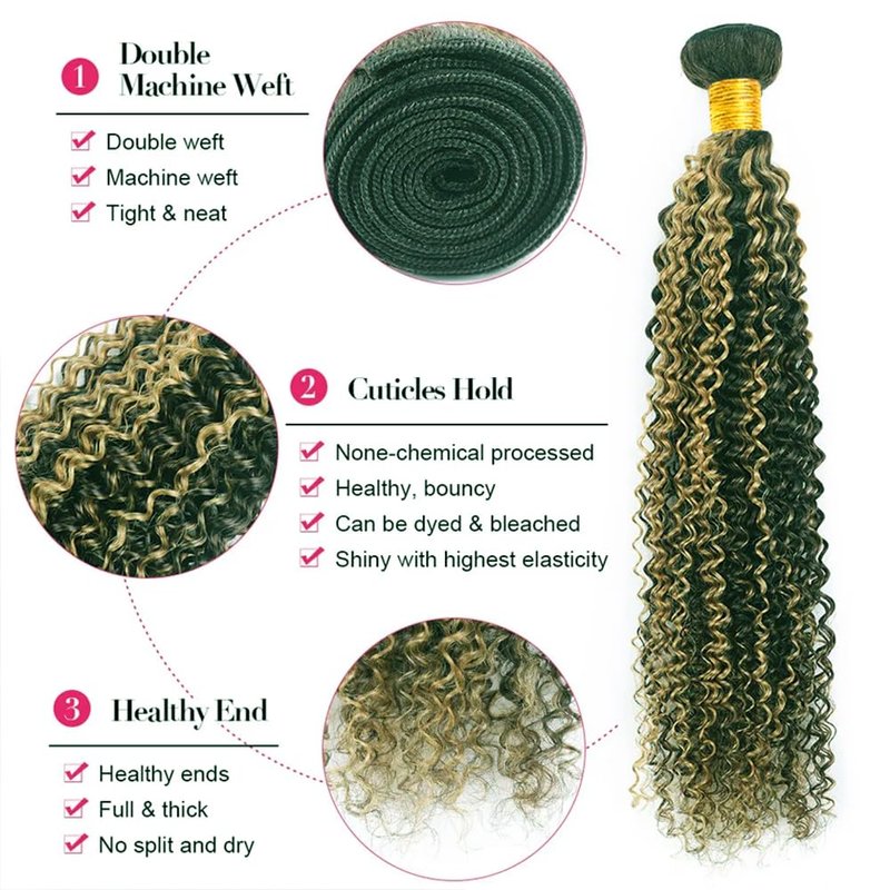 - 1.Human Hair Material:Unprocessed Brazilian Human Hair Bundles ,Brazilian P1B/27 Highlight Blonde Kinky Curly Bundles ,No Tangles,No Shedding,No Chemical,Soft & Silky Clean & Neat.