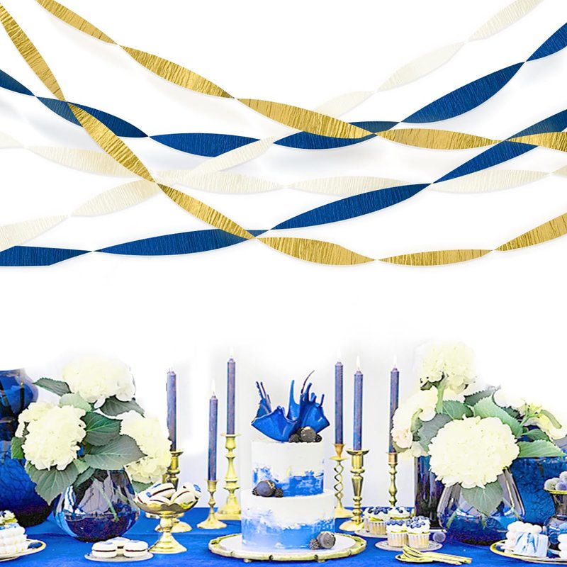 - PREMIUM CREPE PAPER - Include 6 rolls crepe paper streamers in 3 colors, navy blue, gold, ivory , and gold color crepe paper is printed on one side. Original design by NICROLANDEE. Made with premium quality crepe paper, recyclable and eco-friendly.