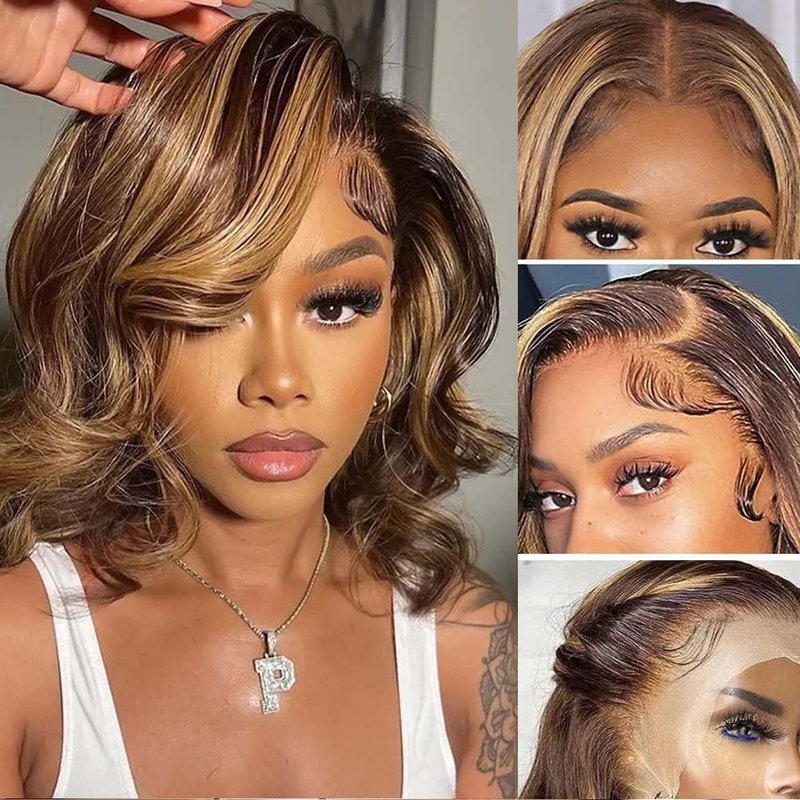 - 【Honey Blonde Bob Wig Human Hair Lace】13x6 transparent hd lace highlight wig human hair. lace melting skin well, 13x6 large lace area, can make the middle part side part and free part as you like.