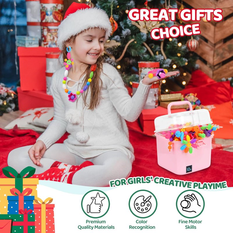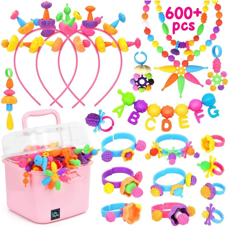 - 【Make a Variety Of Jewelry】The Crafts for Kids ages 4-8 Pop beads set can be made into bracelets, necklaces, rings, and headbands! The popular girls jewelry making kit comes with 550+ colorful jewelry beads, including 2 headbands and a sturdy plastic box for easy storage.