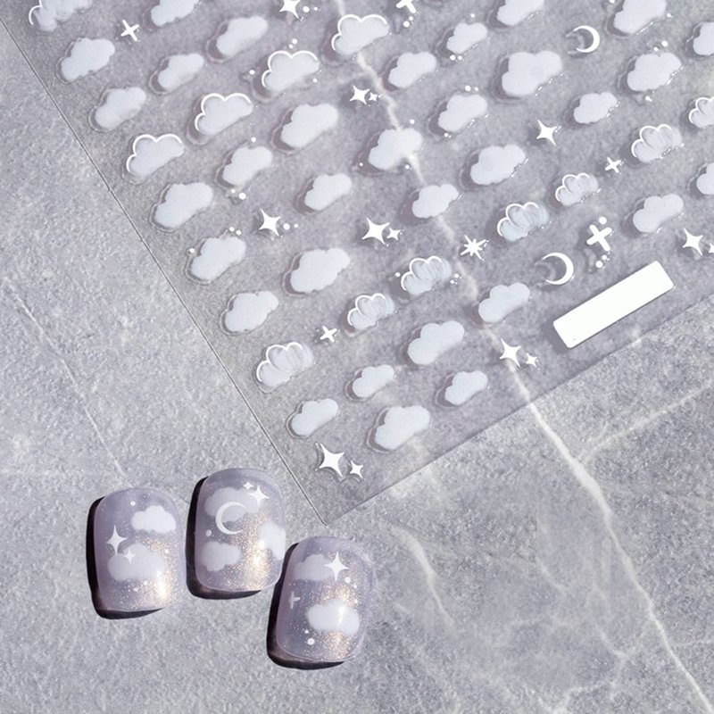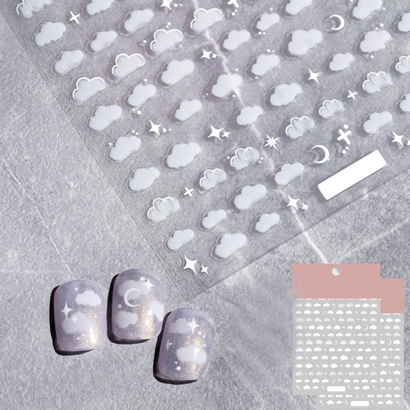 - 【What you will get】: You will get 2 sheets identical white moon star cloud pattern nail art stickers 3d self-adhesive nail decals, semi transparent design,sticker size: 5.11 inch X 3.66 inch. They have separate packaging, so you can easily store them for reuse after using.