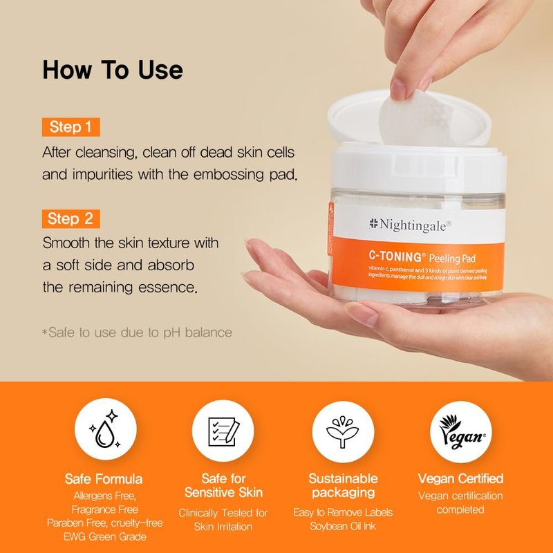Nightingale C-toning Peeling Pads with Vitamin Complex + AHA∙BHA∙PHA + Niacinamide, Exfoliating Peel Pads, Sebum Care, Improve Skin Texture, Hypoallergenic, Vegan Pads, korean skin care