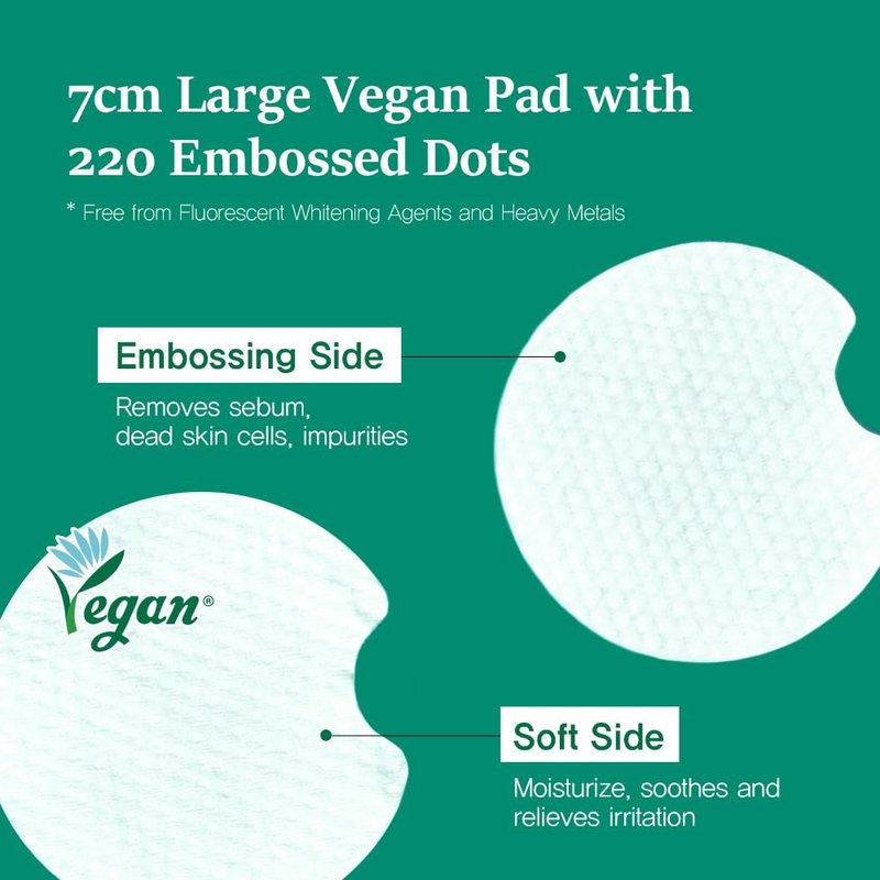 - [Large Double-Sided VEGAN PAD] Large 7cm double-sided vegan pads with 220 embossed textures help clear pore impurities. These pads are vegan-certified, fluorescent brightener-free, and SGS certified, making them safe even for sensitive skin.