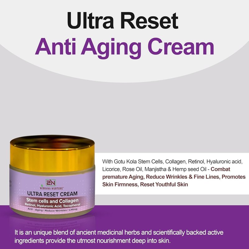 - SYNERGY OF ADVANCE SCIENCE & ANCIENT MEDICINE HERBS: Nirvana Nurture Ultra-Reset anti-aging cream offers a distinctive fusion of ancient medicinal herbs and scientifically supported active components, including Gotu Kola Stem Cells, Collagen, Retinol, Hyaluronic acid, Licorice, Rose Oil, Manjistha, and Hemp Seed Oil. This unique blend penetrates deeply into the skin, delivering essential nourishment of the skin. It combats premature aging signs such as wrinkles, fine lines and boosts skin firmness and enhances skin elasticity, lifting. It is suitable for all skin types.