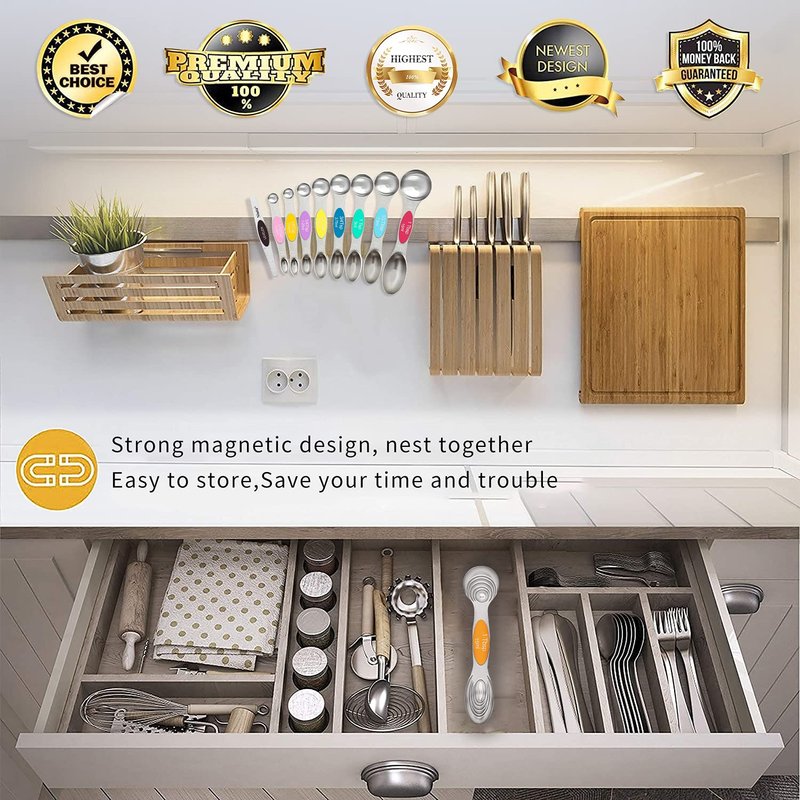 - ✔【MAGNETIC FOR EASY USE AND STORAGE 】- Each piece of this measuring spoon set has a strengthen magnetic center allowing for easy tightly stacks together in the drawer ,you don't have to take them out of the ring and put them back in, and they return to their original position with a touch. These measuring spoons store easily and stay together, strong Magnetic do the job to keep these neatly in the drawer.