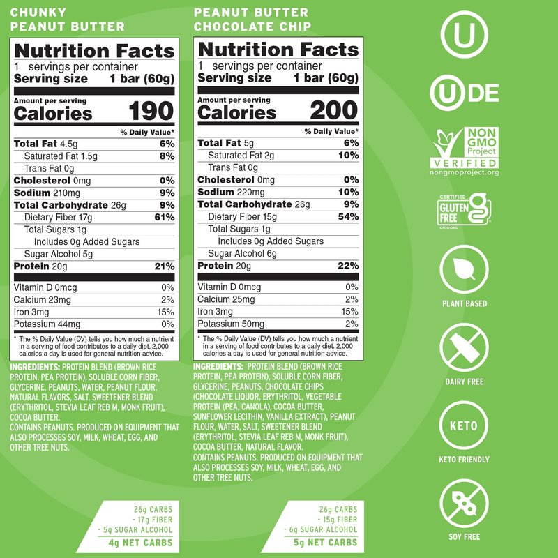 - CLEAN PLANT BASED PROTEIN: Clean fuel without any whey. One protein bar always has at least 20g of protein and only 1g of sugar. These vegan protein bars are great for active lifestyles of men and women. Our bars are certified gluten free, GMO-free (Non-GMO Project verified), soy free, refined sugar free, and kosher.