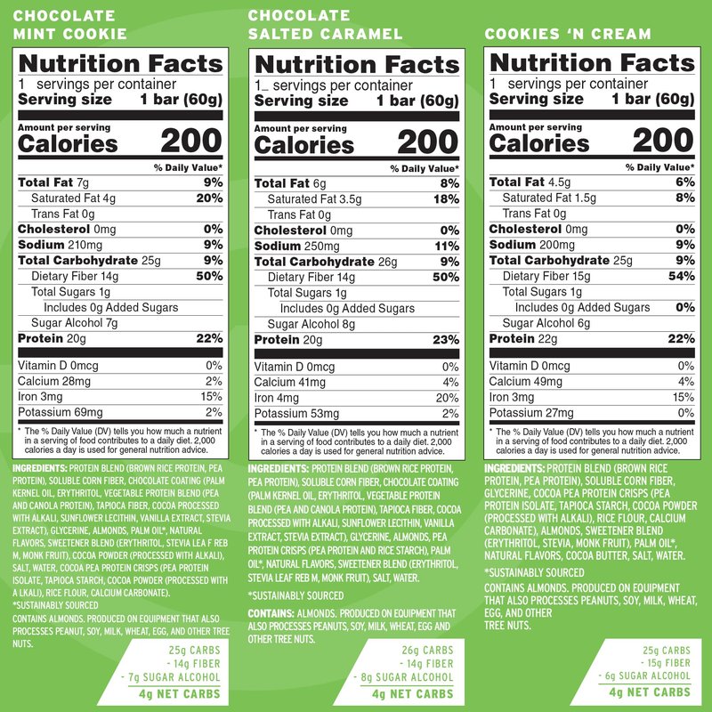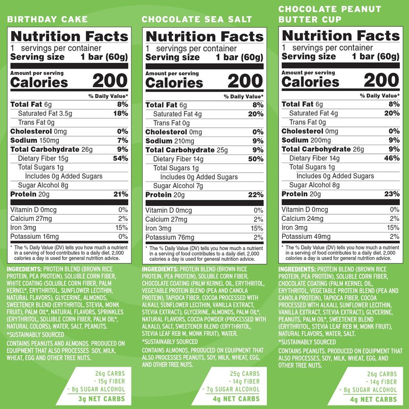 Big taste, dairy-free, high protein, non-gmo, and ridiculously low sugar. No Cow protein bars are the cleanest source of dairy-free fuel out there. So grab a No Cow bar, get out there, and crush it! Try our top flavors in this sample box and find what one bar is your favorite flavor. Assortment may vary.