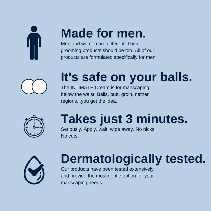 The Intimate Cream is our more gentle option made for everything below the belt. If it's a place you aren't allowed to show in public, use this. No nicks, no cuts, and takes just 3 minutes. The Powder will leave you odor-free and chaff-free all day. The perfect ball powder to keep you dry and fresh on those hot days.