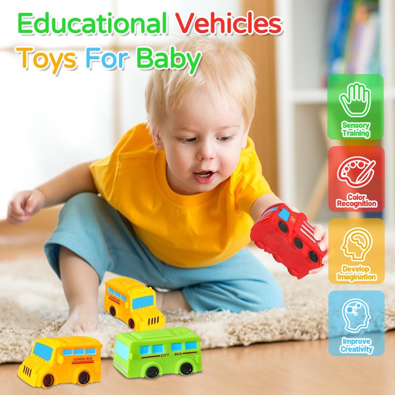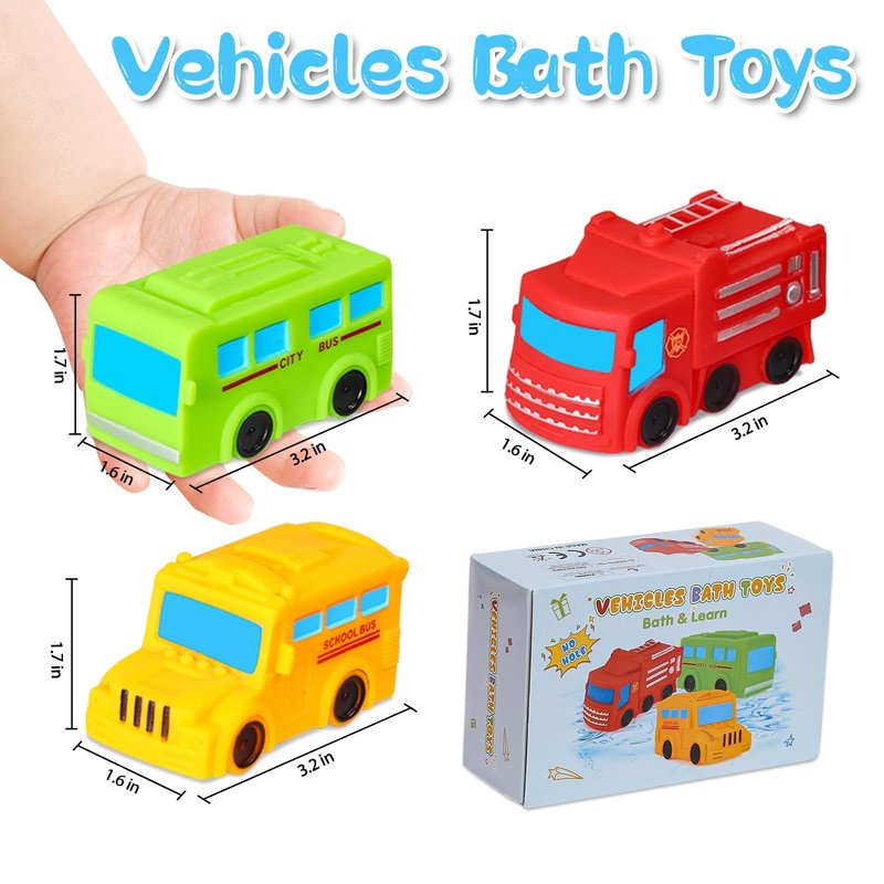 - Bath and Learn: Each set contains 3 vehicles: a fire truck, a school bus, and a regular bus. These no-hole bath toys help babies become familiar with each vehicle during play, allowing them to intuitively understand the different functions of each vehicle and develop their brain
