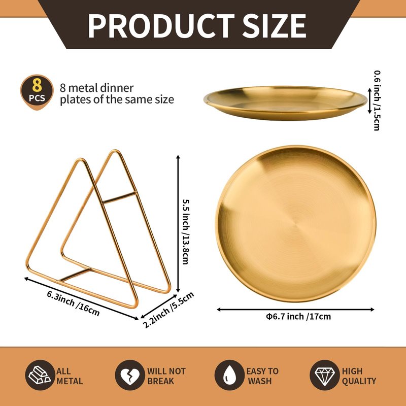 No Name No Seal 8-piece 6.5-inch appetizer plate with stand set Gold silver stainless steel round plates Suitable for cakes desserts, salads, dips, snacks, side dishes (Gold, 6.5inch)