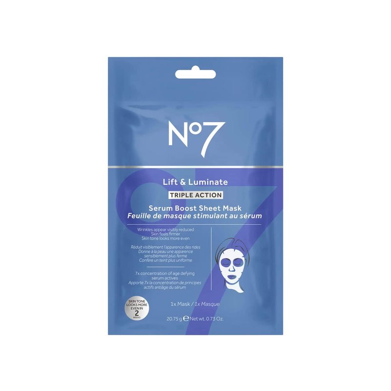 No7 Lift & Luminate Triple Action Serum Boost Sheet Mask - Radiant Skin Firming Anti Aging Face Mask with Hyaluronic Acid & Hibiscus - Vitamin C Brightening & Hydrating Sheet Mask