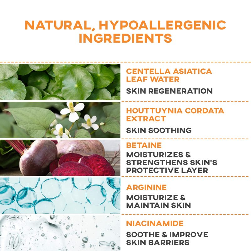 Hypoallergenic toner in a light, non-sticky formulation composed of glyceryl glucoside and Centella leaf water.