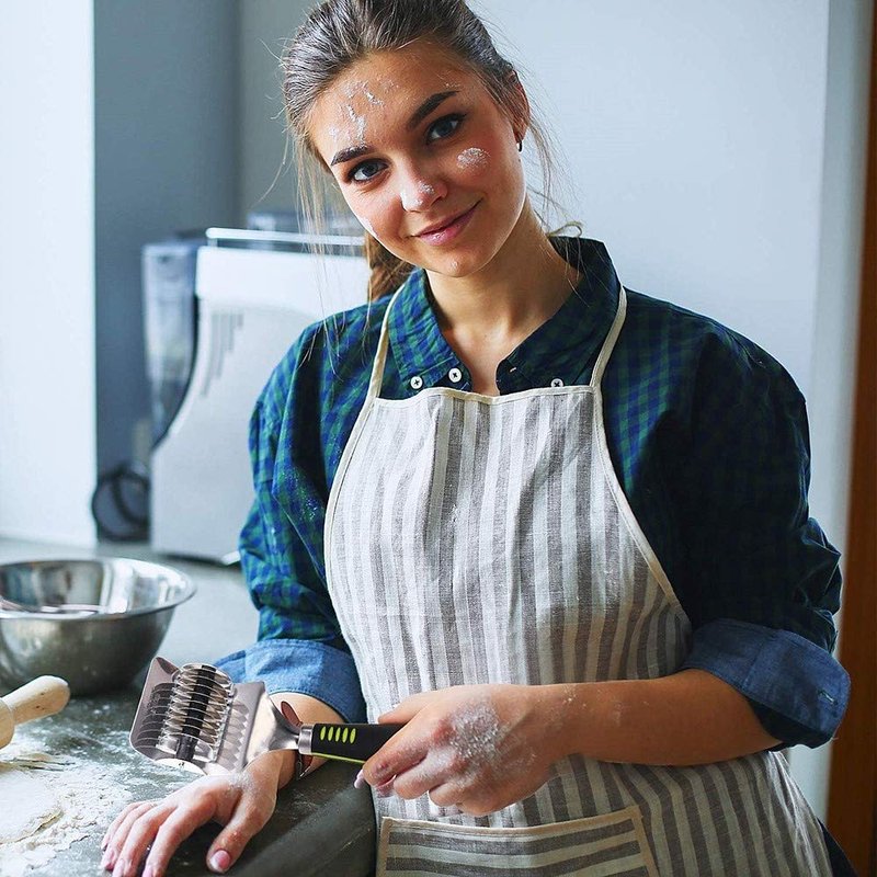 - Multi-wheel design: the noodle grid roller is driven by 9 pieces side by side, which can cut eight even-sized noodles, the top of the handle has a hole design, and you can choose to hang on the wall. 360 degree cutting 360 degree flip The cutting model is neat and let the operation more convenient.