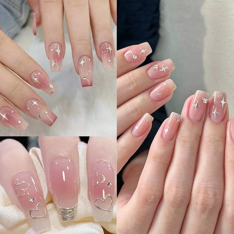 - ✨Perfect Nail Art Set: A package containing 7 different themed 3D nail stickers with a silver metallic liquid feel, featuring elements such as stars, moon, cross, hollow heart, solid heart, hollow pentagram, solid pentagram, butterfly, etc. These gel nail stickers are perfect for adding charm to your nails.