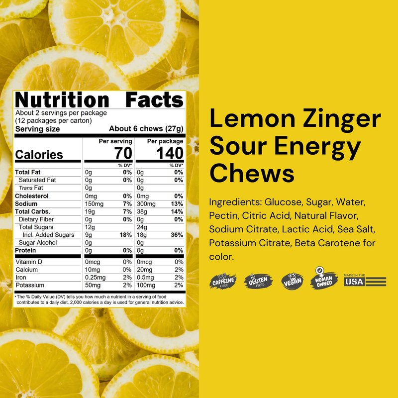 1 carton of 12 packets. Each packet contains 2 serving. Energy chews that taste like your favorite sour gummy candies. Gluten-free, vegan, and formulated with easy-to-digest carbohydrates and electrolytes to support performance. Bite-sized, easy-to-chew, Enjoy them the run, bike, swim, court, trail, or anywhere else you like to stay active!