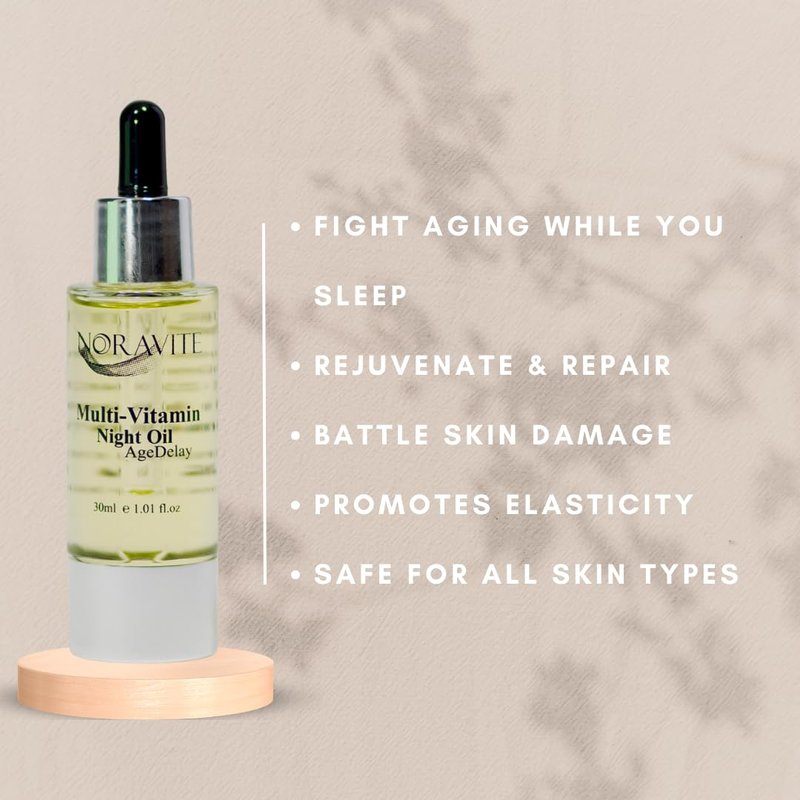 NORAVITE AgeDelay Multi-Vitamin Night Facial Oil - Intensive Skin Tightening Oil & Moisturizer - Nourishes Protects & Rejuvenates - Antioxidant Serum w/Vitamin E, Omega 3,6,9 & Seaweed - 30ml