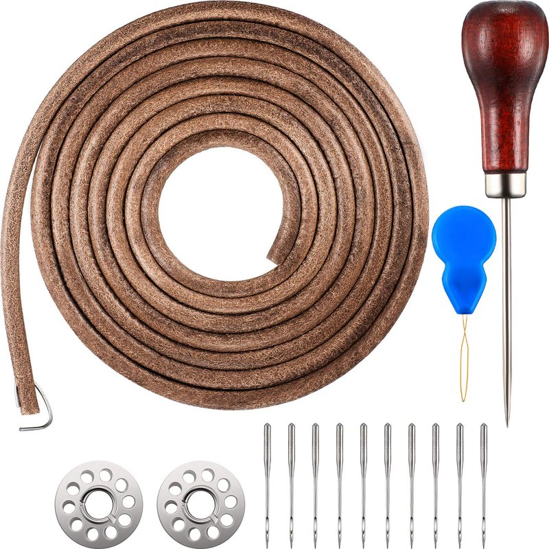 - Package includes: a quality leather sewing machine belt, with a perforating cone, 10 pack sewing machine needles, a needle piercer and 2 bobbin