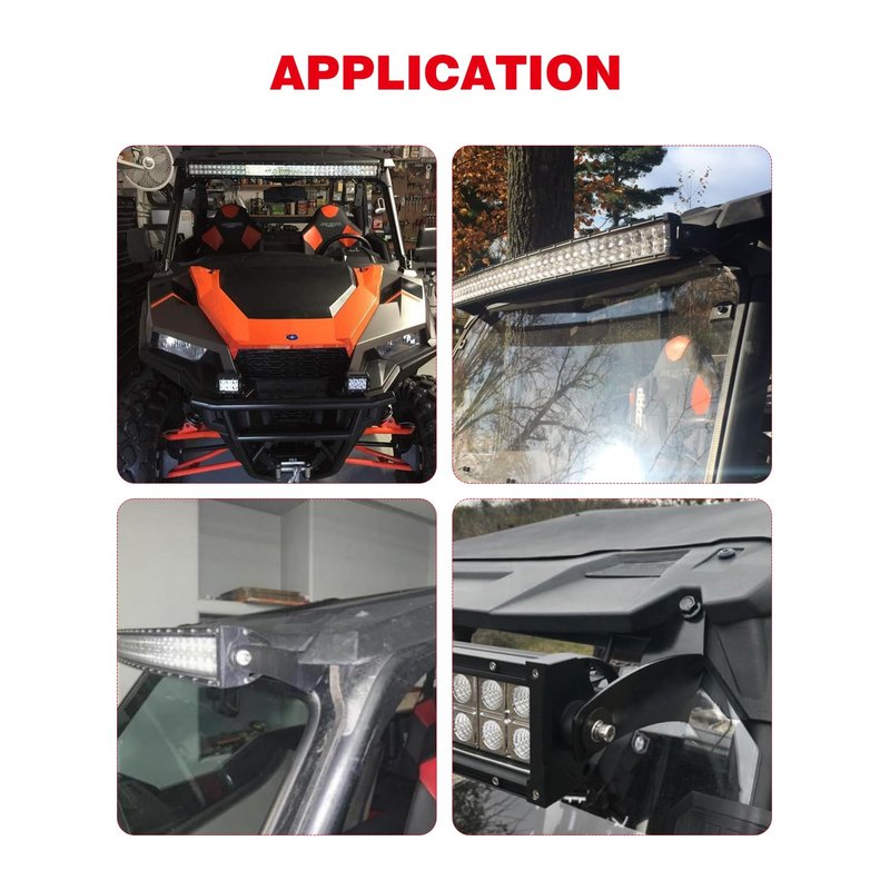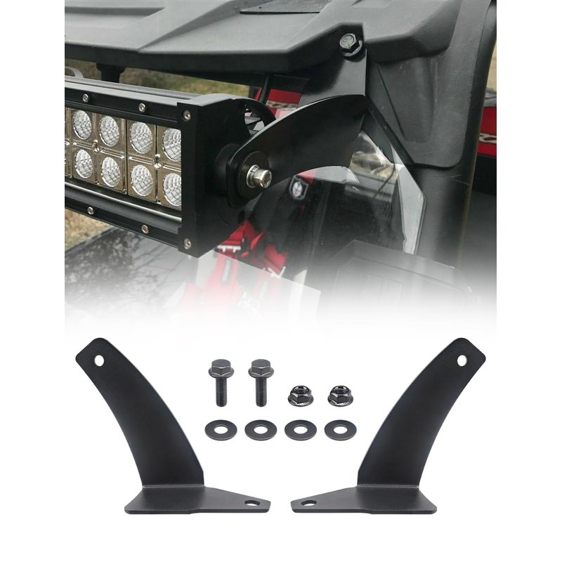 COMPATIBILITY 42” inch led light bar mounting brackets compatible with 2016 and up Polaris General 1000. NOTE - When using on the General these will not work with the grass Flip Up windshield. Work with 42 inch curved Light Bar. NOTE - The lens of the light is 40" the mounting points need to be 42". FEATURE One of the best and easiest solution to add a 42" LED light bar. Providing powerful illumination for safer off-road driving. Solid Steel, CNC laser cut, black powder coated finish for a long service life. WHAT’S IN BOX? 2 x 42” light bar mounts (Left + Right) 2 x Bolt 2 x Nut 4 x Washer