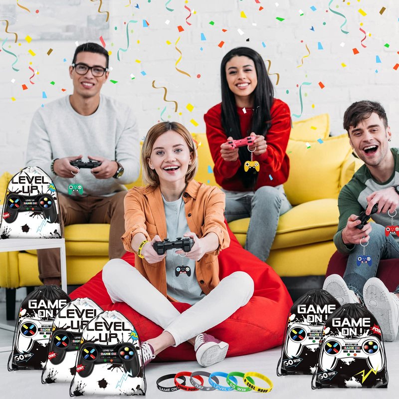 Nosiny 72PCS Video Game Party Favors Birthday Include 24 Video Game Goodie Drawstring Bags 24 Silicone Bracelet 24 Controller Keychain for Kids for Party Supplies (Black, White, Cute)