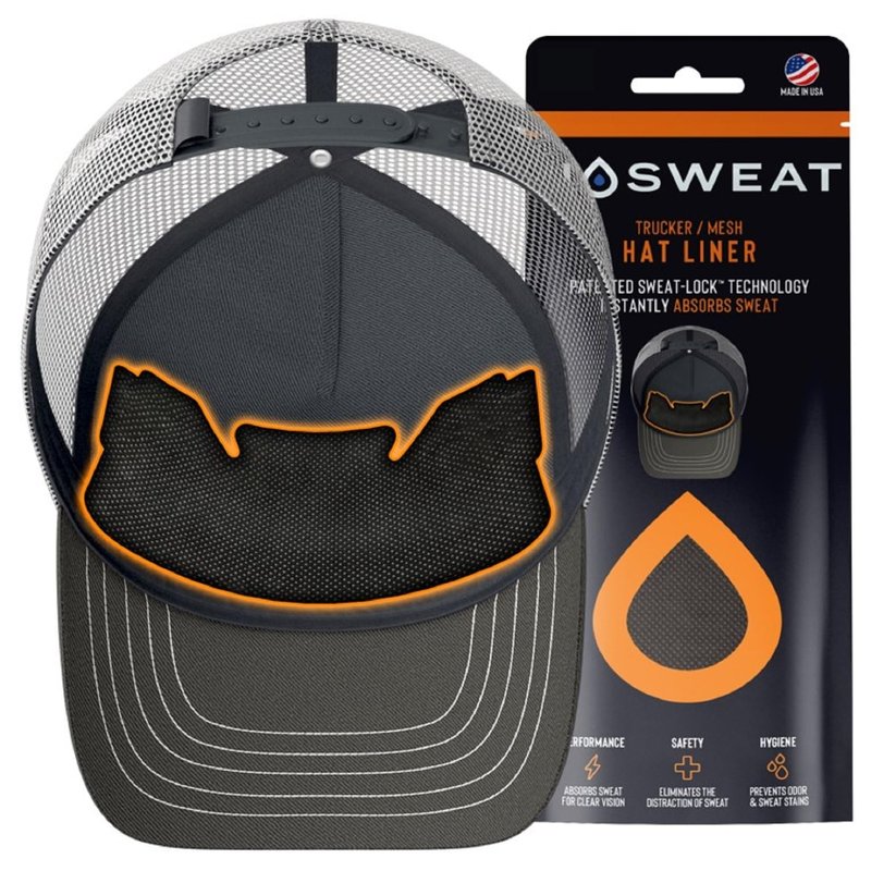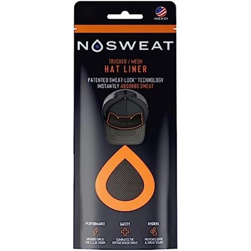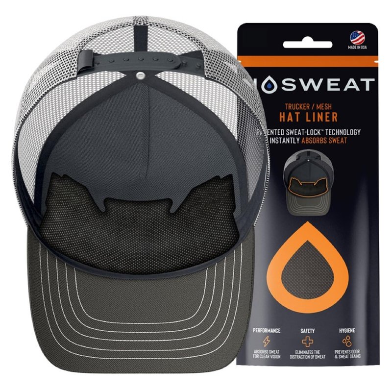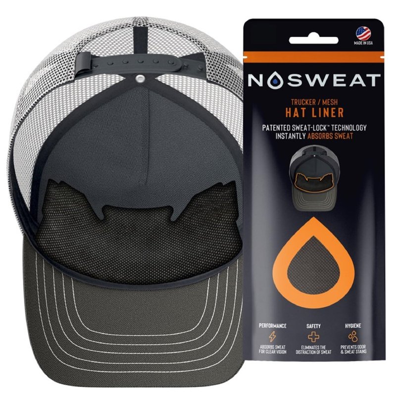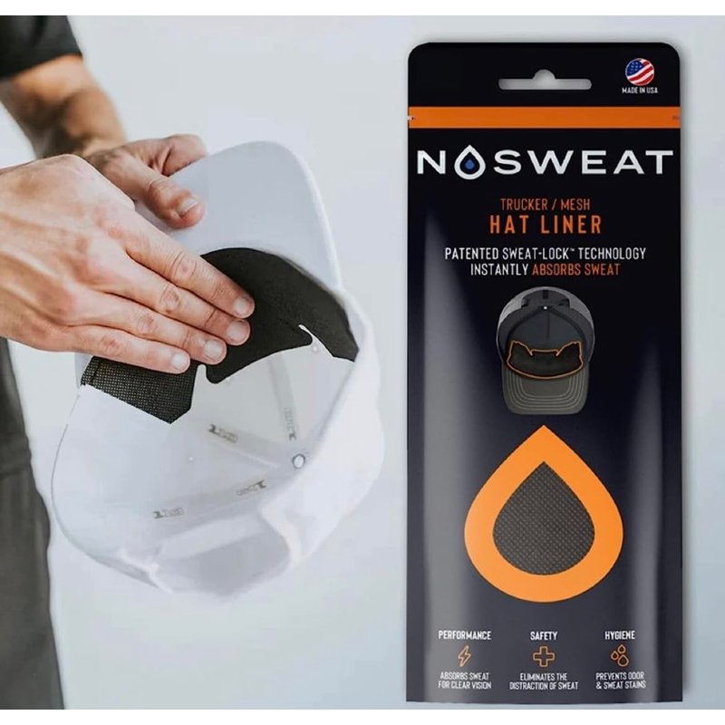 No Sweat Trucker Hat Sweat Liner & Mesh Sweat Hat Liner is a disposable Liner / Sweat Absorber that sticks on the inside of ANY hat, cap, mask or helmet and soaks up sweat so you do NOT have sweat dripping down onto your face and into your eyes or glasses while you are playing or training. Sports players of all ages and levels are currently using NoSweat in their hats NoSweat’s patented design and Dri-LID technology is engineered to absorb forehead sweat and clear your line of vision. Allowing you to keep your eye on the prize and take your game to a whole new level. No Scent technology helps prevent stains and eliminate odors, keeping your LID Cleaner. Fresher. Longer. BENEFITS: Keeps sweat out of your eyes & glasses Prevents NASTY Sweat Stains on your LID Hypoallergenic -- Helps prevent acne & skin irritation Comfortable -- Thin, soft, and lightweight. No Scent Technology -- Reduces Odor Reduces Sweat & FOG in glasses or eyewear Patented universal design -- Sticks inside the front and/or back of any LID 100% AMERICAN MADE"