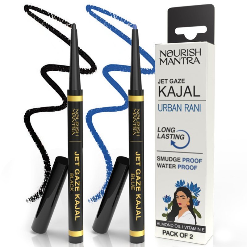NOURISH MANTRA Jet Gaze Kajal Urban Rani - Combo - Black & Blue 0.35g | With Almond Oil, Argan Oil & Vitamin E | Intense Pigmentation | Smudge Proof | Water Proof | Long Lasting