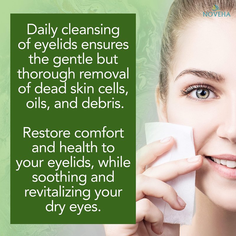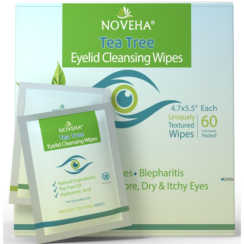NOVEHA 60PCs Tea Tree Oil Eyelid & Lash Wipes | With Hyaluronic Acid, Green Tea & Chamomile For Blepharitis, Itchy & Stye Eyes, Individually Wrapped, Natural Eyelash Makeup Remover & Daily Cleanser