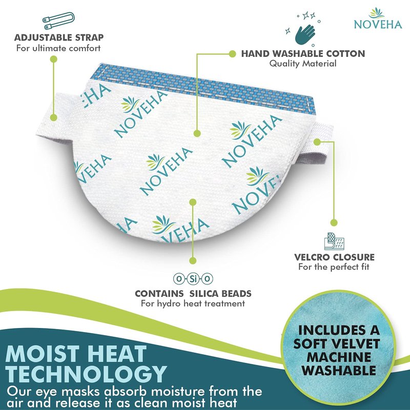 How it works:Our eye masks are activated using hydro-heat technology by absorbing moisture from the air and releasing it as clean moist heat. Using this technology, our mask soothes and hydrates your irritated, puffy, itchy eyes, relieves discomfort, and just helps you relax! Whether you suffer from eyelid bumps, blepharitis, pink or stye eyes, you will see how much better you feel!Instructions:Heat approach: Place the mask in a microwave on a paper towel.Set power to high and heat for 20 seconds. Before applying, always touch the eye mask with fingers first, to test for the desired temperature. For additional heat, microwave in 5-second increments until the desired temperature is reached. Do not exceed a maximum of 30 seconds of heating. Insert the mask into the washable cover or use it directly without the coverPlace the mask over closed eyes and secure it with an adjustable strap, if preferred.Apply the mask for 5-10 minutes or as directed by your doctor. Do not apply for more than 20 minutes at a time.Cold approach: Place the mask in a sealable plastic bag and then in the freezer for 30 minutes. Remove the mask from the freezer and withdraw from the plastic bag. Insert the mask into the washable cover or use it directly without the cover. Place the mask over closed eyes, securing with the adjustable strap, if preferred. Wear for 5 to 7 minutes or as directed by your doctor.Washing directions:Only the mask cover can be washed in the washing machine.The mask itself can be hand cleaned with NOVEHA wipes or with a wet cloth and a small amount of mild soap. Then let air dry. Do not submerge in water.Includes:1 Moist Technology Eye Mask with an adjustable strap and velcro fastening1 Silk washable coverClick “Add to cart” now, and get ready to be pampered TODAY!