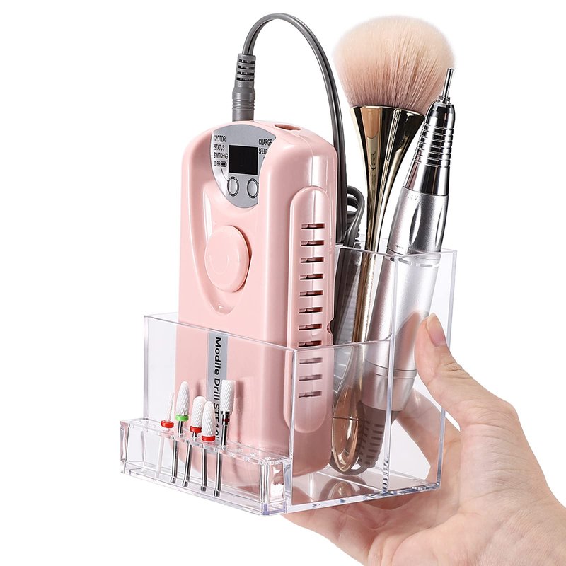 - 【3 Rows Design from Low to High】-- Designed with 3 rows, the lowest layer with 10 small holes for holding nail art drill bits, the middle layer for nail drill machine, and the highest layer with 2 compartments for storage nail drill machine plugs and pens (Also can display makeup brushes, eyebrow, eyeshadow, eyeliner pencils and other nail art & makeup tools )