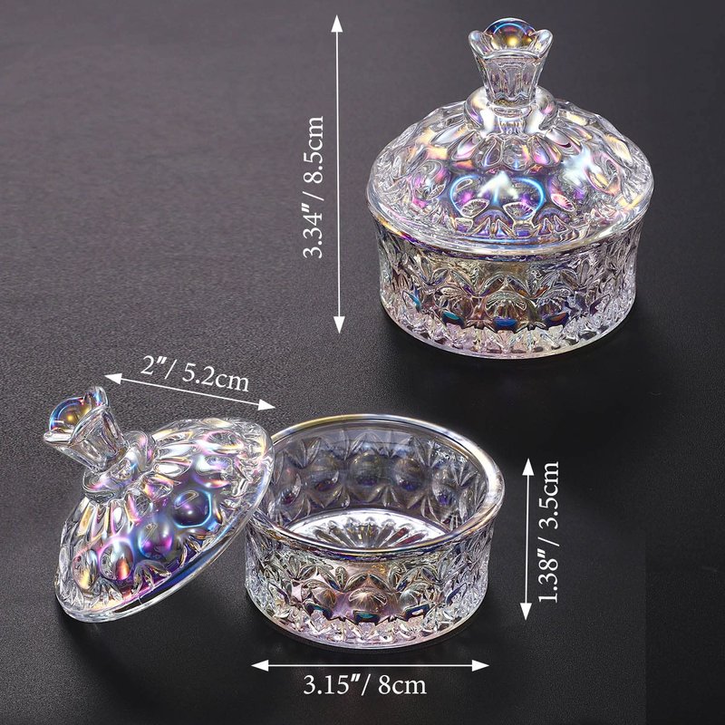Features & Benefits 🔮 Made of superior glass and featured with special design. 🔮 Durable crystal dappen dish looks fantastic in your work station with beautiful sharp body that fits all taste. 🔮 Perfect for liquids, powder, decorative beads, per your needs. 🔮 Glass lid to prevent liquid from volatilizing and contain the smell. Specifications: Material: Glass Color: Rainbow color Size: 7.9 x 8.2cm /3.1" x 3.2" Weight: 0.441 pounds Package: 1 x nail dappen dish with lid Note: Please allow a slight differences due to manual measurement.