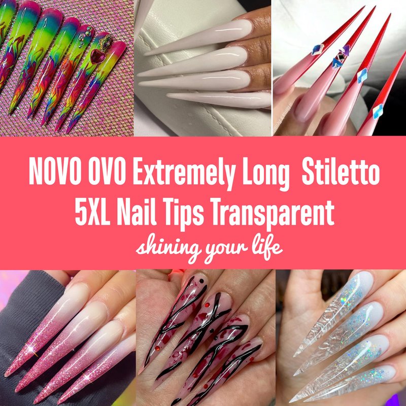 NOVO OVO Extra Super Extreme Long Stiletto Nail Tips, 5XL XXXXXL Clear Full Cover French Tips False Fake Nail Extension, Sharp Fishbone Arrow Head Nails for Professional Acrylic 120 pcs 12 Size
