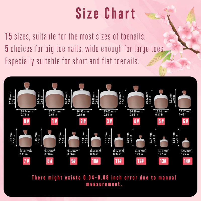 - 【FIND YOUR PERFECT FIT】We understand that one size doesn't fit all. That's why our nail tips come in 15 different sizes for your toes and 5 size options specifically for your big toe (hallux). Whether you have wide toes or not, our nail tips are suitable for various feet sizes. With 360 pieces, you'll have enough for at least 12 perfect pedicures!