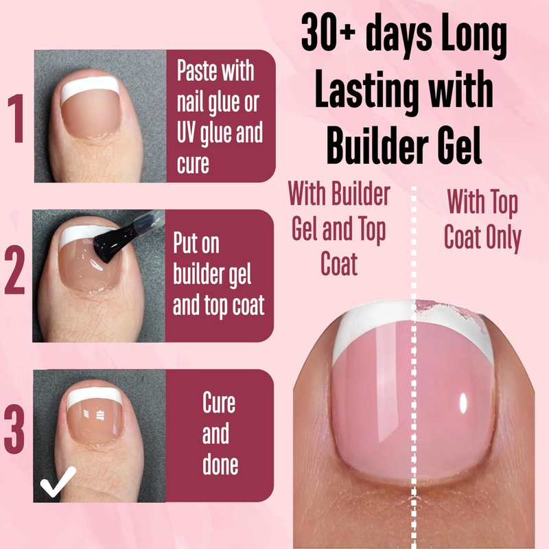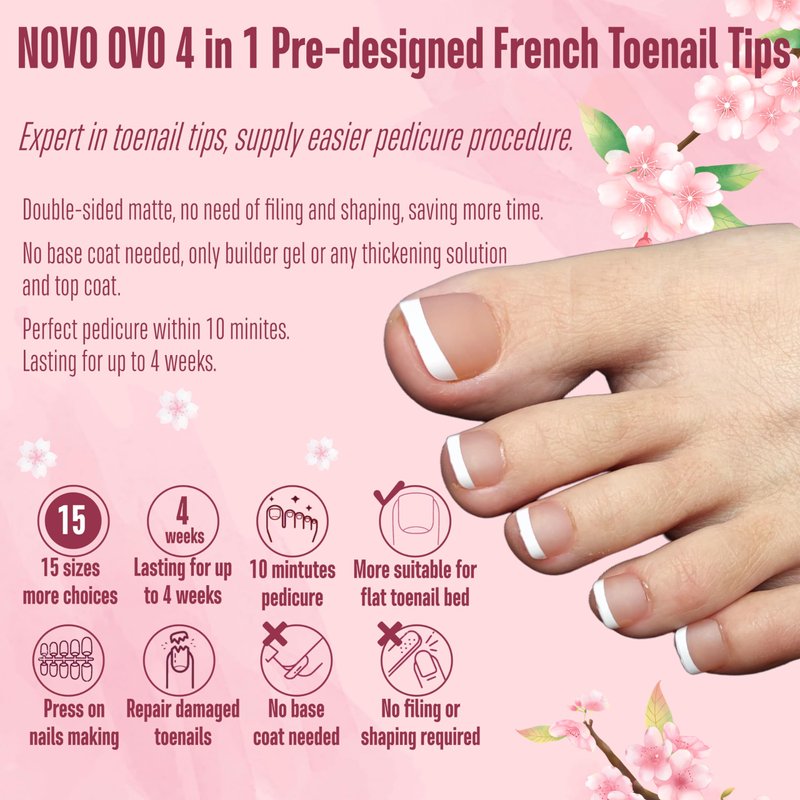 - 【GET THE PERFECT FRENCH TIP PEDICURE WITH JUST A FEW SIMPLE STEPS!】NOVO OVO pre-designed nails are here to make your pedicure easier! We've already applied a tip primer and base coat on the soft gel nail tips. Simply stick them on your nails with UV gel or glue, then add a layer of builder gel and top coat. In just 15 minutes, you'll have stunning french tips on your toenails!