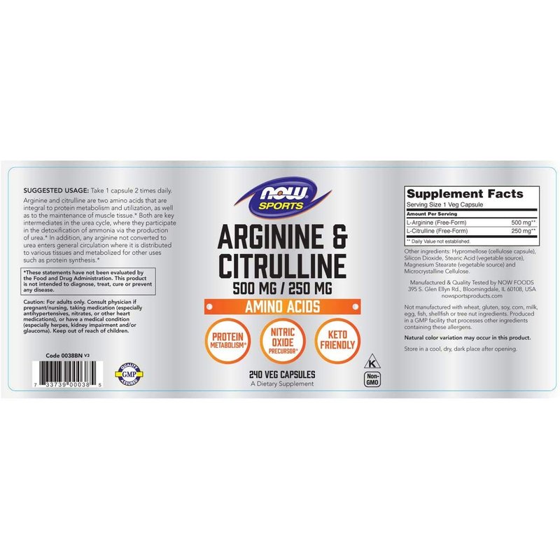 - NOW Sports Nutrition, Arginine & Citrulline 500 mg/ 250 mg, Amino Acids, 240 Veg Capsules
