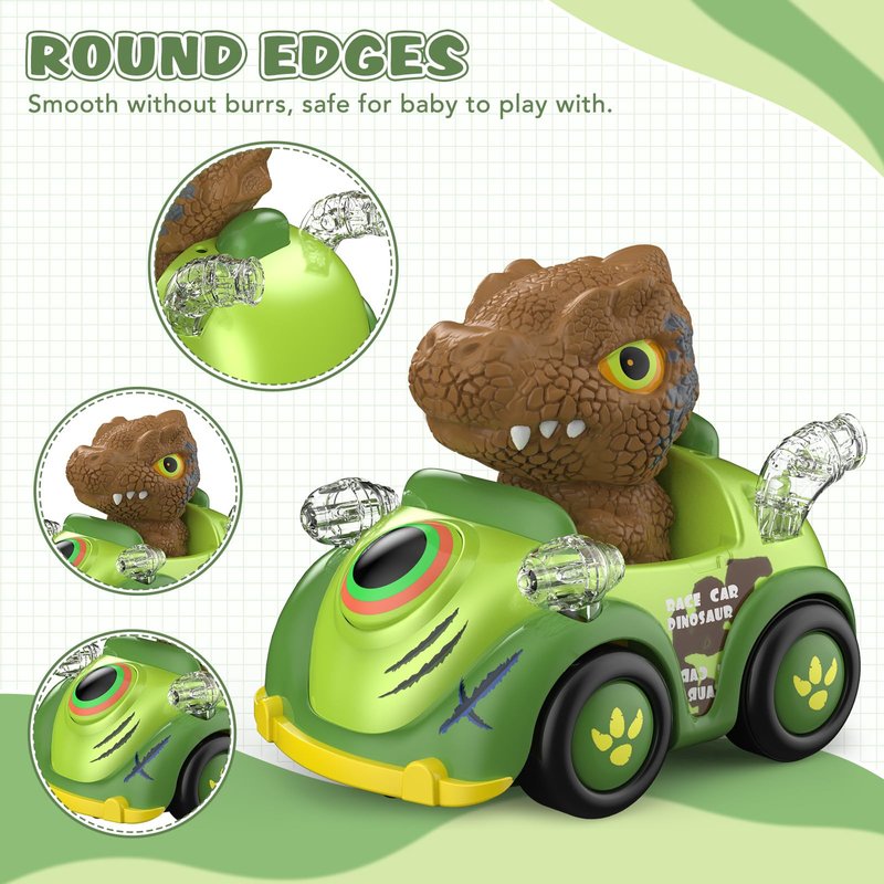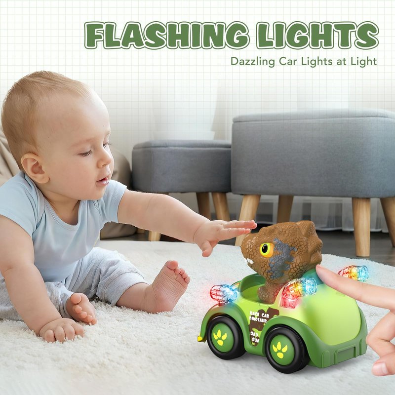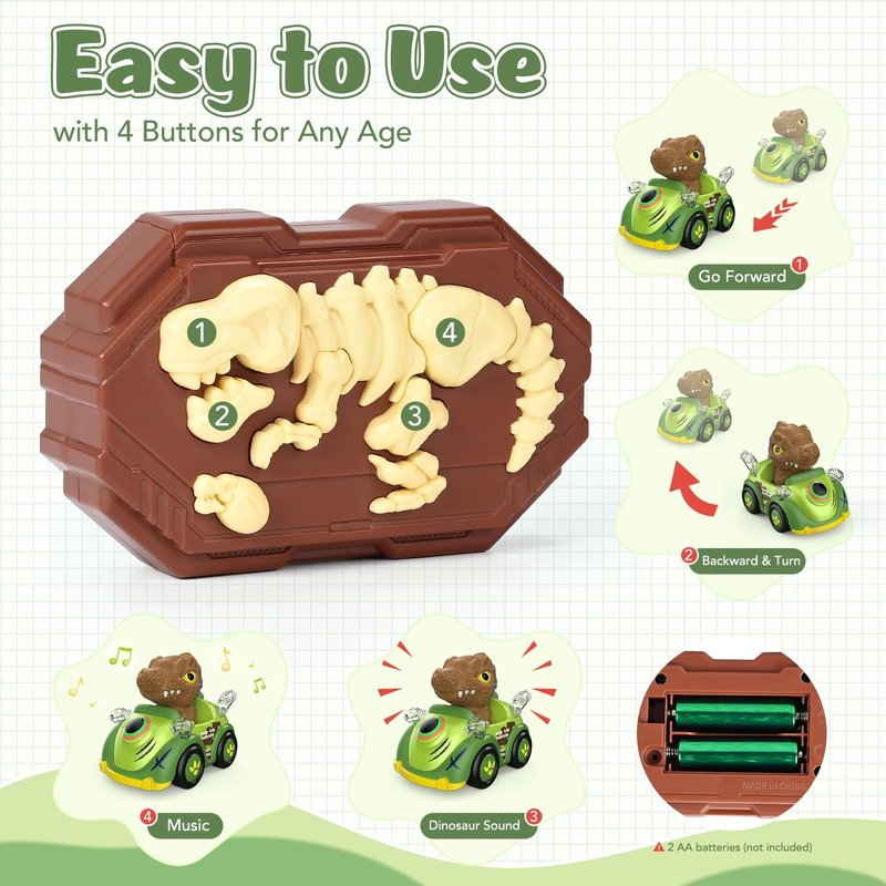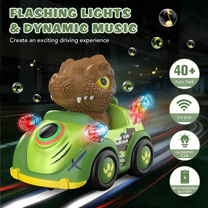 - 【Dinosaur Remote Control Car】This dinosaur remote control car has multiple functions that are fun for toddlers to play with. The flashing LED headlights effect vivify this remote control monster truck while playing indoors and outdoors. The remote control car can also play music and you can simply switch the music or turn it off by controller for toddlers 1-3 3-5 5-7 age.