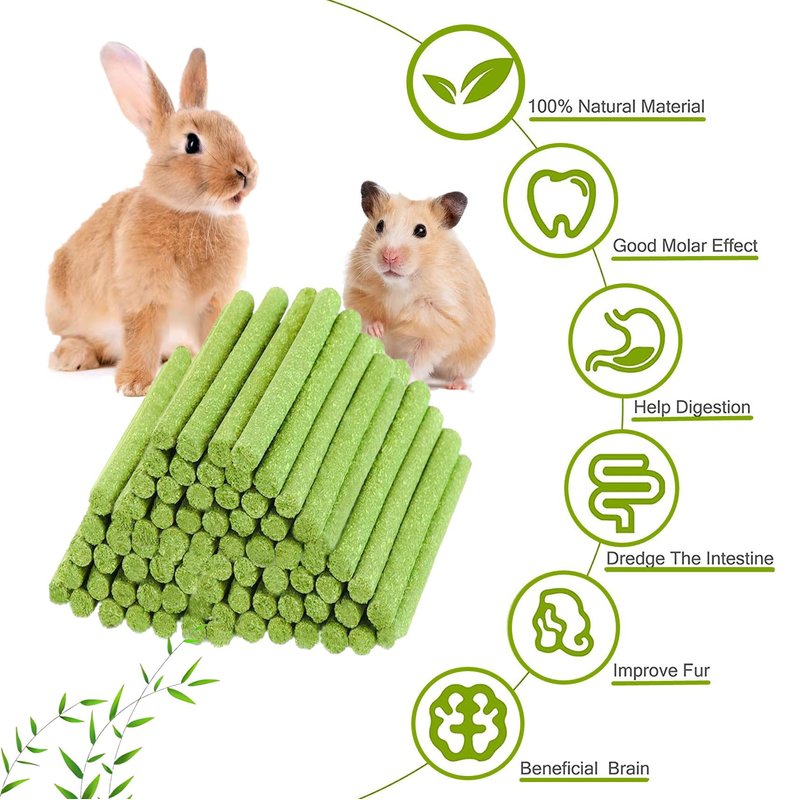 - 1.【Rabbit Toy & Bunny Food】:Timothy hay sticks for guinea pig handmade from 100% natural material, healthy & harmless timothy hay grass for rabbit.Hamster timothy toy contains high fiber, low protein, multiple vitamins. Timothy hay for rabbit not just a molar clean teeth bunny treat snack,bunny hay also can be used as a hamster chew toy. Rabbit chew treats are very beneficial to small animals. (Included 48PCS)