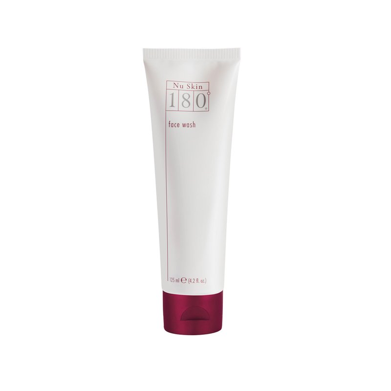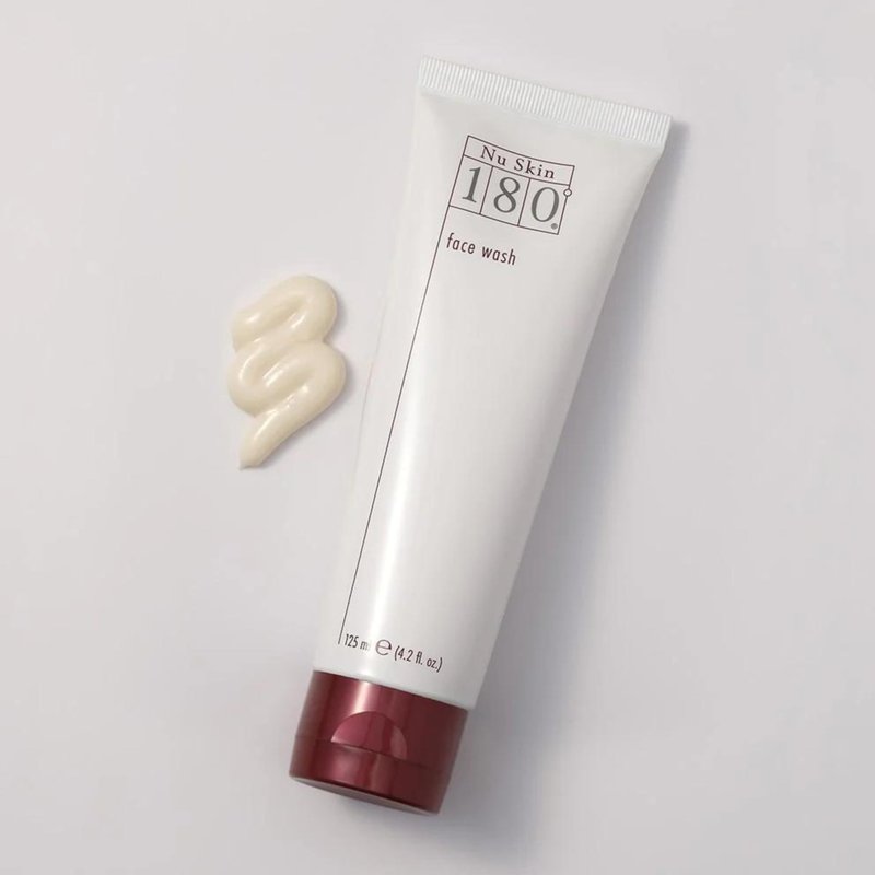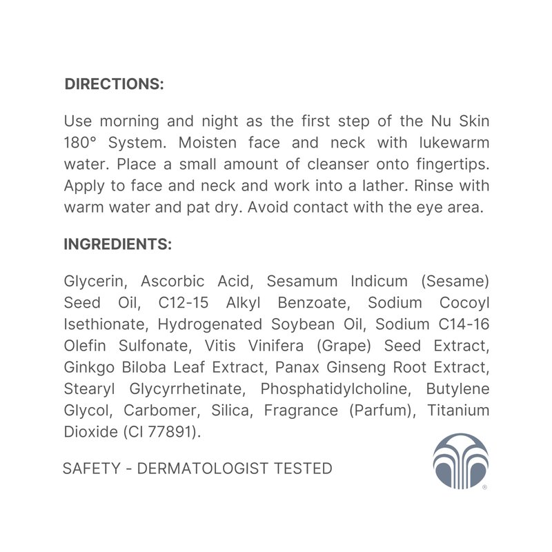 Nu Skin 180° Face Wash is an anti-aging cleanser with a creamy, waterless base that features 10% active Vitamin C. This powerful formula is designed to reduce the appearance of lines, wrinkles, and dark spots while enhancing skin firmness and brightness. Key ingredients such as Grape Seed Extract, Ginkgo Biloba Leaf Extract, and Ginseng Extract provide antioxidant protection, helping to neutralize free radicals and minimize skin damage. Sesame and Soybean oils in the formula act as emollients to prevent moisture loss, supporting the skin’s natural moisture barrier. Part of the Nu Skin 180° Anti-Aging Skin Therapy System, this cleanser is formulated to promote a youthful appearance. In a controlled eight-week clinical study, participants using the system noted improvements in skin texture, radiance, and a reduction in discoloration, pores, and wrinkles. For best results, use Nu Skin 180° Face Wash morning and night as the first step of the Nu Skin 180° System. Apply directly to the face without lathering in your hands to maintain the effectiveness of the active Vitamin C. For sensitive skin, perform a patch test on a small area before applying to the entire face.